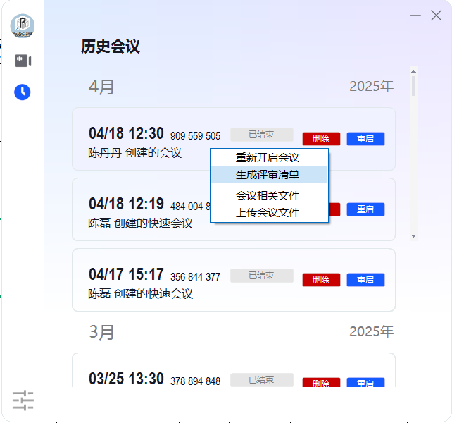 在历史会议的列表里,鼠标右键单击结束的会议,弹出后期处理菜单,如下图所示: