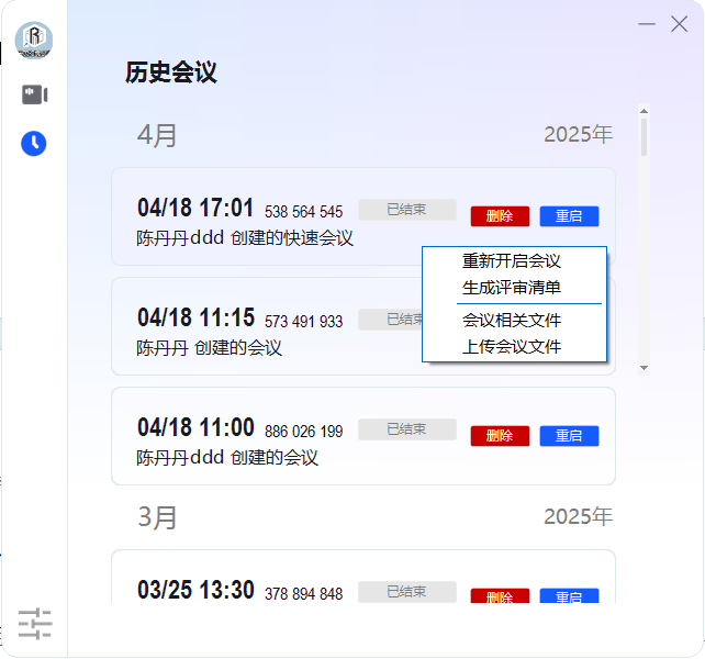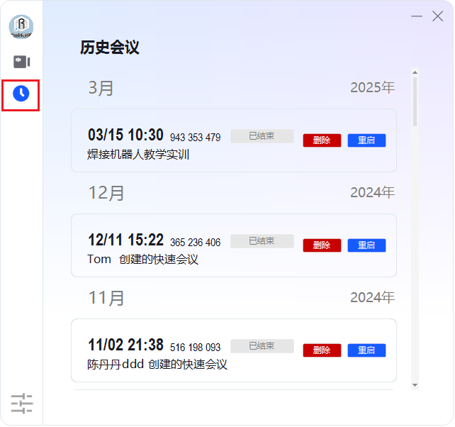 历史会议里记录之前账号创建的所有会议,如需重新开启会议,只要选择对应会议双击会议即可,点击重新开启会议即可。