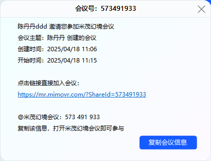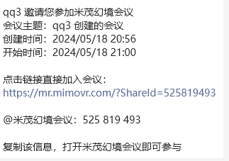 鼠标选择“复制会议信息”后,可把会议信息粘贴到微信中,邀请朋友加入该会议。参考【1.3.3.加入会议】