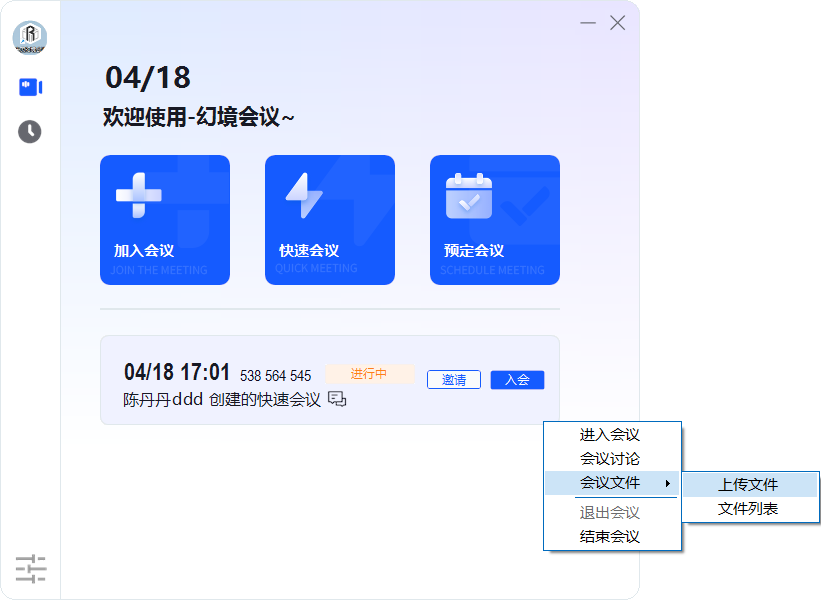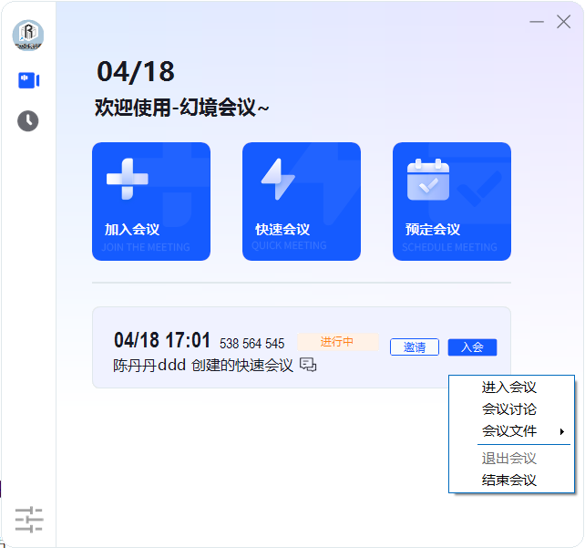 在进行中的会议列表中,鼠标右键单击会议项,弹出的右键菜单如下: