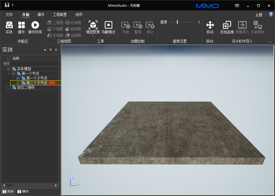 新添加的节点会出现在大纲视图中,允许用户在此节点下进一步添加子节点、导入IMM格式的模型文件或MGT格式的组件文件。当从工业设计软件导入选定场景时,相关节点及其内容会自动嵌入到大纲树中。完成Mrt工程保存后,所有新增的节点详情都会被工程文件所记录。