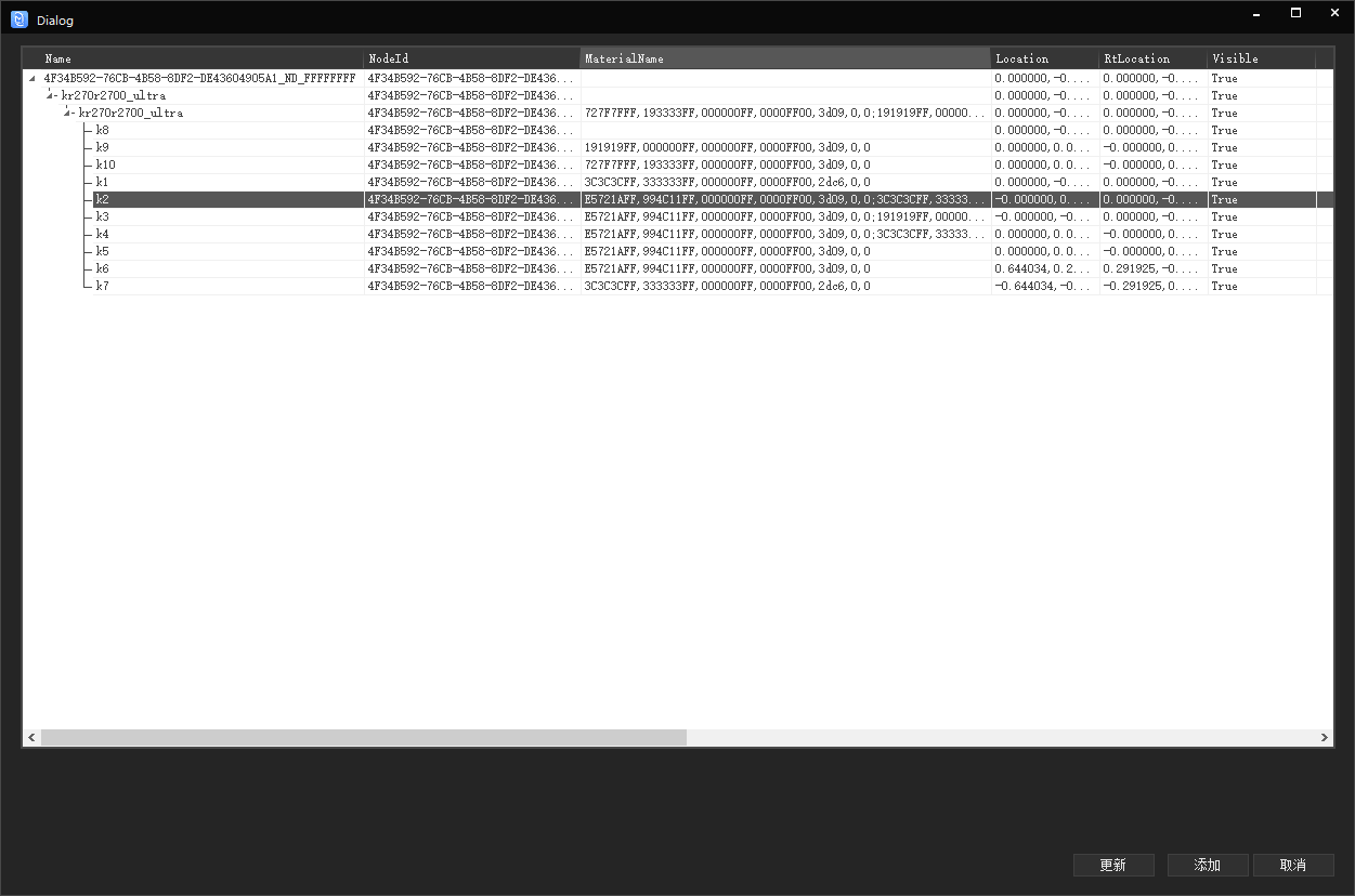 【模型文件属性】窗口中,显示【k2】节点上的材质信息,鼠标选择列出的材质,材质属性显示在下部的【漫射】、【环境】、【镜面】、【发射】的中,修改【漫射】、【环境】、【镜面】、【发射】的值,材质的变化显示在列表中和三维场景中。