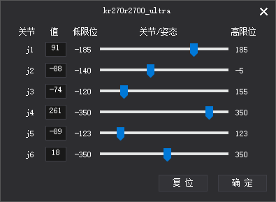 在该窗口中,调节关节的数值,调整【kr270r2700_ultra】的关节位置,如下图所示: