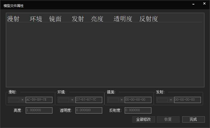 在【模型文件属性】窗口中,选择【全部修改】,添加一项默认的材质到材质列表中。
